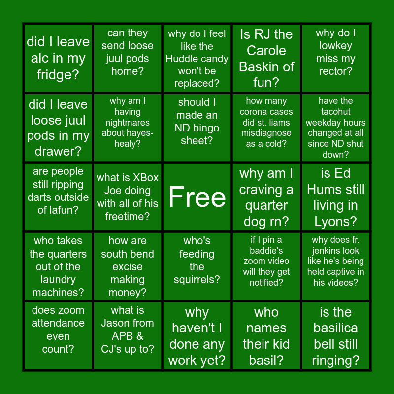 This bingo card has a free space and 24 words: how are south bend excise making money?, what is Jason from APB & CJ's up to?, should I made an ND bingo sheet?, does zoom attendance even count?, why do I lowkey miss my rector?, did I leave alc in my fridge?, did I leave loose juul pods in my drawer?, can they send loose juul pods home?, why am I craving a quarter dog rn?, who's feeding the squirrels?, how many corona cases did st. liams misdiagnose as a cold?, are people still ripping darts outside of lafun?, if I pin a baddie's zoom video will they get notified?, why does fr. jenkins look like he's being held captive in his videos?, why am I having nightmares about hayes-healy?, who names their kid basil?, is Ed Hums still living in Lyons?, why do I feel like the Huddle candy won't be replaced?, have the tacohut weekday hours changed at all since ND shut down?, what is XBox Joe doing with all of his freetime?, is the basilica bell still ringing?, who takes the quarters out of the laundry machines?, Is RJ the Carole Baskin of fun? and why haven't I done any work yet?.