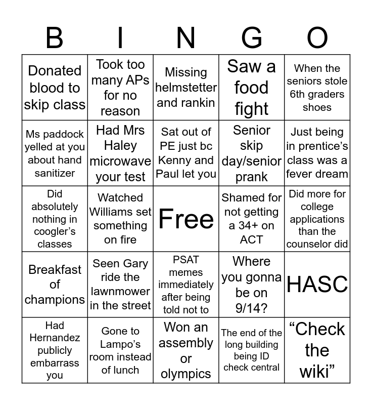 This bingo card has a free space and 24 words: Seen Gary ride the lawnmower in the street, Gone to Lampo’s room instead of lunch, Sat out of PE just bc Kenny and Paul let you, Had Hernandez publicly embarrass you, When the seniors stole 6th graders shoes, Donated blood to skip class, Ms paddock yelled at you about hand sanitizer, Took too many APs for no reason, Shamed for not getting a 34+ on ACT, PSAT memes immediately after being told not to, Senior skip day/senior prank, Did absolutely nothing in coogler’s classes, Where you gonna be on 9/14?, HASC, Had Mrs Haley microwave your test, The end of the long building being ID check central, Did more for college applications than the counselor did, Missing helmstetter and rankin, Just being in prentice’s class was a fever dream, Watched Williams set something on fire, “Check the wiki”, Breakfast of champions, Saw a food fight and Won an assembly or olympics.