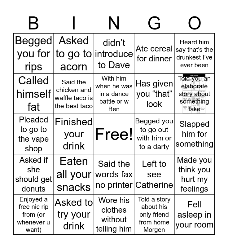 This bingo card has 1 images, a free space and 24 words: Enjoyed a free nic rip from (or whenever u want), Eaten all your snacks, With him when he was in a dance battle or w Ben, Told a story about his only friend from home Morgen, Heard him say that’s the drunkest I’ve ever been, Begged you for rips, Asked to go to acorn, didn’t introduce to Dave, Begged you to go out with him or to a darty, Slapped him for something, Pleaded to go to the vape shop, Said the chicken and waffle taco is the best taco, Left to see Catherine, Made you think you hurt my feelings, Called himself fat, Asked to try your drink, Wore his clothes without telling him, Ate cereal for dinner, Told you an elaborate story about something fake, Asked if she should get donuts, Finished your drink, Said the words fax no printer, Has given you “that” look and Fell asleep in your room.