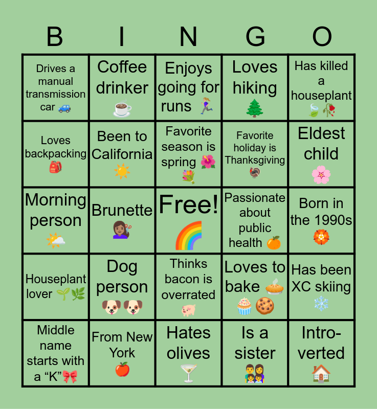 This bingo card has a free space and 24 words: Dog person πΆπΆ, From New York π, Favorite season is spring πΊπ, Middle name starts with a βKβπ, Has killed a houseplant ππ₯, Drives a manual transmission car π, Loves backpackingπ, Coffee drinker βοΈ, Passionate about public health π, Thinks bacon is overrated π, Favorite holiday is Thanksgiving π¦, Morning person π€, Loves to bake π₯§π§πͺ, Has been XC skiing βοΈ, Been to California βοΈ, Is a sister π¨βπ©βπ§βπ¦, Born in the 1990s π΅, Enjoys going for runs ππΌββοΈ, Eldest child πΈ, Brunette ππ½ββοΈ, Intro-verted π , Houseplant lover π±πΏ, Loves hiking π² and Hates olives πΈ.
