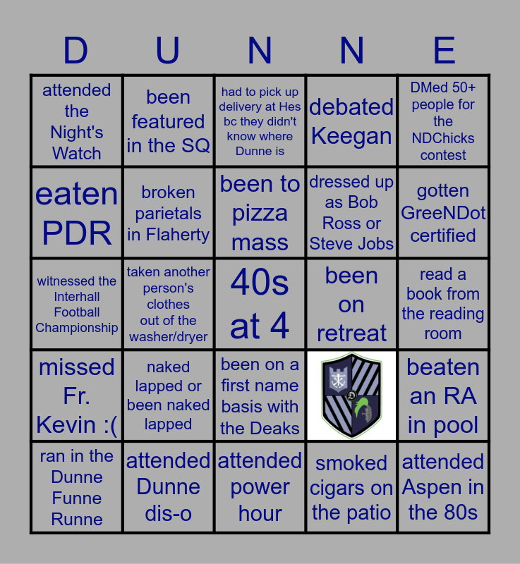 This bingo card has 1 images and 24 words: naked lapped or been naked lapped, attended power hour, been to pizza mass, ran in the Dunne Funne Runne, DMed 50+ people for the NDChicks contest, attended the Night's Watch, eaten PDR, been featured in the SQ, been on retreat, been on a first name basis with the Deaks, dressed up as Bob Ross or Steve Jobs, witnessed the Interhall Football Championship, beaten an RA in pool, broken parietals in Flaherty, attended Aspen in the 80s, read a book from the reading room, had to pick up delivery at Hes bc they didn't know where Dunne is, gotten GreeNDot certified, taken another person's clothes out of the washer/dryer, 40s at 4, attended Dunne dis-o, missed Fr. Kevin :(, debated Keegan and smoked cigars on the patio.