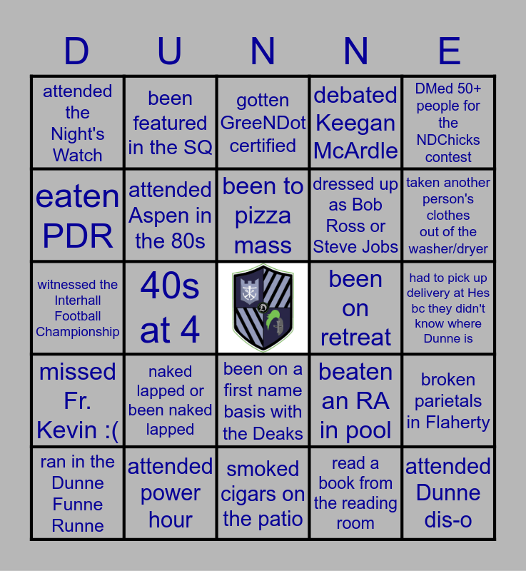 This bingo card has a free space and 24 words: naked lapped or been naked lapped, attended power hour, been to pizza mass, ran in the Dunne Funne Runne, DMed 50+ people for the NDChicks contest, attended the Night's Watch, eaten PDR, been featured in the SQ, been on retreat, been on a first name basis with the Deaks, dressed up as Bob Ross or Steve Jobs, witnessed the Interhall Football Championship, beaten an RA in pool, broken parietals in Flaherty, attended Aspen in the 80s, read a book from the reading room, had to pick up delivery at Hes bc they didn't know where Dunne is, gotten GreeNDot certified, taken another person's clothes out of the washer/dryer, 40s at 4, attended Dunne dis-o, missed Fr. Kevin :(, debated Keegan McArdle and smoked cigars on the patio.