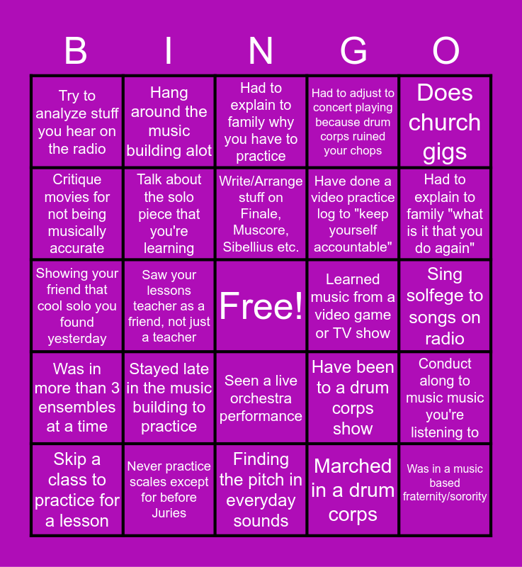 This bingo card has a free space and 24 words: Stayed late in the music building to practice, Never practice scales except for before Juries, Write/Arrange stuff on Finale, Muscore, Sibellius etc., Skip a class to practice for a lesson, Does church gigs, Try to analyze stuff you hear on the radio, Critique movies for not being musically accurate, Hang around the music building alot, Learned music from a video game or TV show, Seen a live orchestra performance, Have done a video practice log to "keep yourself accountable", Showing your friend that cool solo you found yesterday, Have been to a drum corps show, Conduct along to music music you're listening to, Talk about the solo piece that you're learning, Marched in a drum corps, Sing solfege to songs on radio, Had to explain to family why you have to practice, Had to explain to family "what is it that you do again", Saw your lessons teacher as a friend, not just a teacher, Was in a music based fraternity/sorority, Was in more than 3 ensembles at a time, Had to adjust to concert playing because drum corps ruined your chops and Finding the pitch in everyday sounds.