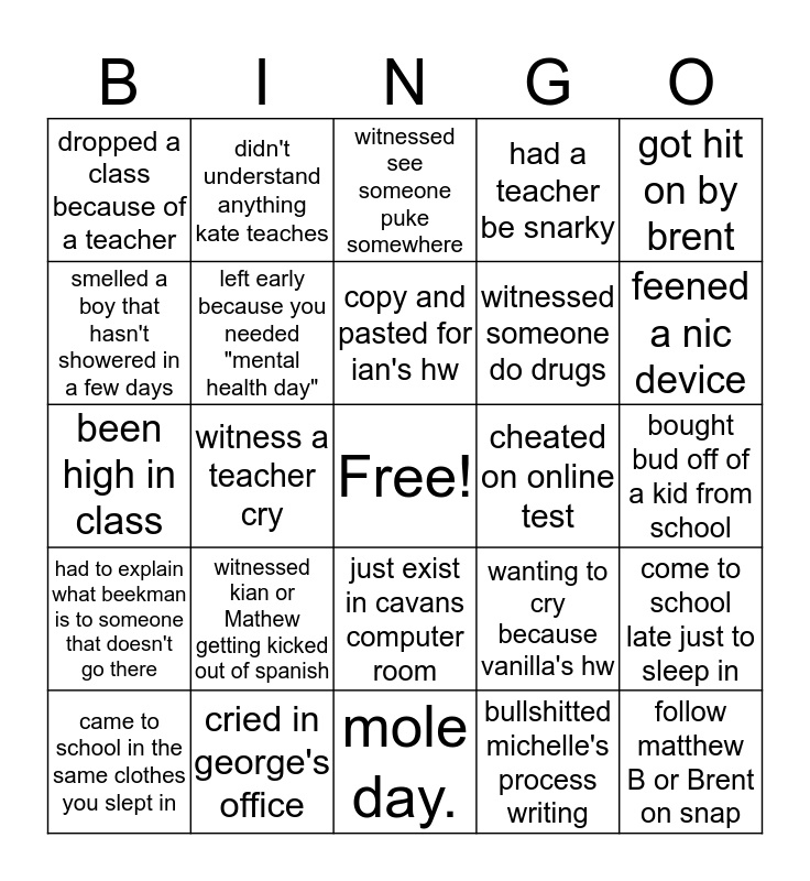 This bingo card has a free space and 24 words: witnessed kian or Mathew getting kicked out of spanish, cried in george's office, copy and pasted for ian's hw, came to school in the same clothes you slept in, got hit on by brent, dropped a class because of a teacher, smelled a boy that hasn't showered in a few days, didn't understand anything kate teaches, cheated on online test, just exist in cavans computer room, witnessed someone do drugs, been high in class, wanting to cry because vanilla's hw, come to school late just to sleep in, left early because you needed "mental health day", bullshitted michelle's process writing, bought bud off of a kid from school, witnessed see someone puke somewhere, feened a nic device, witness a teacher cry, follow matthew B or Brent on snap, had to explain what beekman is to someone that doesn't go there, had a teacher be snarky and mole day..