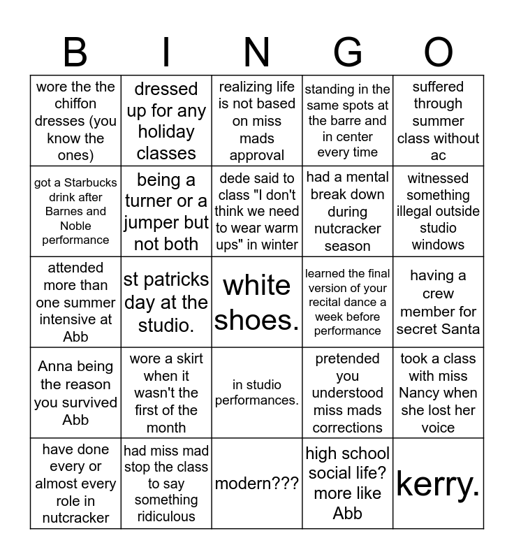 This bingo card has a free space and 24 words: wore a skirt when it wasn't the first of the month, had miss mad stop the class to say something ridiculous, dede said to class "I don't think we need to wear warm ups" in winter, have done every or almost every role in nutcracker, suffered through summer class without ac, wore the the chiffon dresses (you know the ones), got a Starbucks drink after Barnes and Noble performance, dressed up for any holiday classes, learned the final version of your recital dance a week before performance, in studio performances., had a mental break down during nutcracker season, attended more than one summer intensive at Abb, pretended you understood miss mads corrections, took a class with miss Nancy when she lost her voice, being a turner or a jumper but not both, high school social life? more like Abb, having a crew member for secret Santa, realizing life is not based on miss mads approval, witnessed something illegal outside studio windows, st patricks day at the studio., kerry., Anna being the reason you survived Abb, standing in the same spots at the barre and in center every time and modern???.