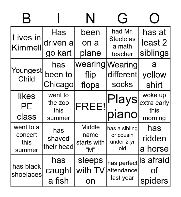 This bingo card has a free space and 24 words: has shaved their head, has caught a fish, wearing flip flops, has black shoelaces, has at least 2 siblings, Lives in Kimmell, Youngest Child, Has driven a go kart, Plays piano, Middle name starts with "M", Wearing different socks, likes PE class, has a sibling or cousin under 2 yr old, has ridden a horse, has been to Chicago, has perfect attendance last year, woke up extra early this morning, been on a plane, a yellow shirt, went to the zoo this summer, is afraid of spiders, went to a concert this summer, had Mr. Steele as a math teacher and sleeps with TV on.