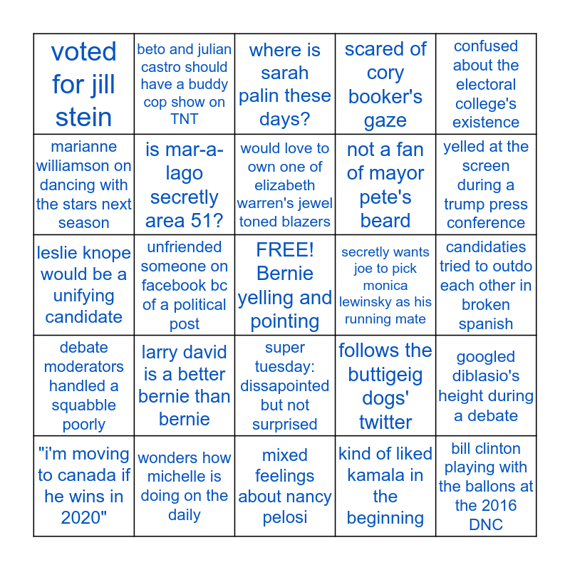 This bingo card has a free space and 24 words: larry david is a better bernie than bernie, wonders how michelle is doing on the daily, would love to own one of elizabeth warren's jewel toned blazers, "i'm moving to canada if he wins in 2020", confused about the electoral college's existence, voted for jill stein, marianne williamson on dancing with the stars next season, beto and julian castro should have a buddy cop show on TNT, secretly wants joe to pick monica lewinsky as his running mate, super tuesday: dissapointed but not surprised, not a fan of mayor pete's beard, leslie knope would be a unifying candidate, follows the buttigeig dogs' twitter, googled diblasio's height during a debate, is mar-a-lago secretly area 51?, kind of liked kamala in the beginning, candidaties tried to outdo each other in broken spanish, where is sarah palin these days?, yelled at the screen during a trump press conference, unfriended someone on facebook bc of a political post, bill clinton playing with the ballons at the 2016 DNC, debate moderators handled a squabble poorly, scared of cory booker's gaze and mixed feelings about nancy pelosi.