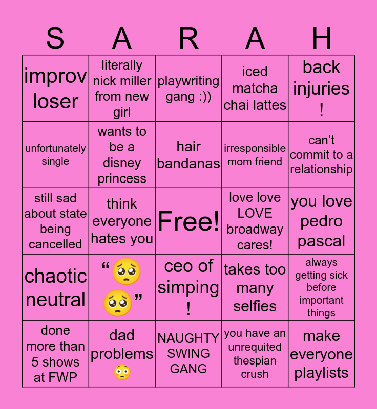 This bingo card has a free space and 24 words: “🥺🥺”, dad problems😳, hair bandanas, done more than 5 shows at FWP, back injuries !, improv loser, unfortunately single, literally nick miller from new girl, love love LOVE broadway cares!, ceo of simping !, irresponsible mom friend, still sad about state being cancelled, takes too many selfies, always getting sick before important things, wants to be a disney princess, you have an unrequited thespian crush, you love pedro pascal, playwriting gang :)), can’t commit to a relationship, think everyone hates you, make everyone playlists, chaotic neutral, iced matcha chai lattes and NAUGHTY SWING GANG.