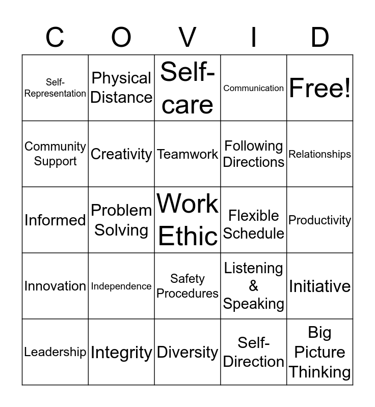 This bingo card has a free space and 24 words: Independence, Integrity, Teamwork, Leadership, Free!, Self-Representation, Community Support, Physical Distance, Flexible Schedule, Safety Procedures, Following Directions, Informed, Listening & Speaking, Initiative, Creativity, Self-Direction, Productivity, Self-care, Relationships, Problem Solving, Big Picture Thinking, Innovation, Communication and Diversity.