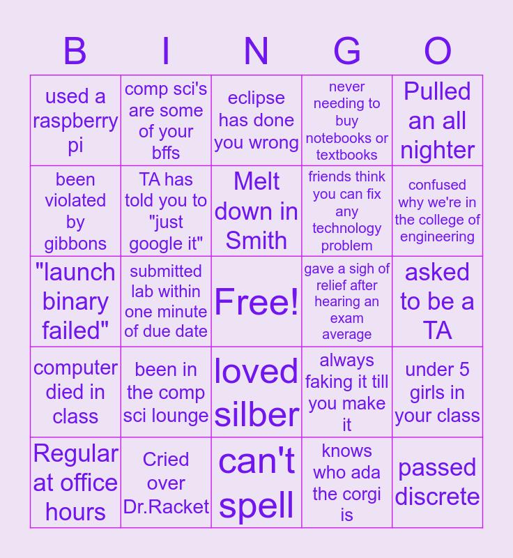 This bingo card has a free space and 24 words: been in the comp sci lounge, Cried over Dr.Racket, Melt down in Smith, Regular at office hours, Pulled an all nighter, used a raspberry pi, been violated by gibbons, comp sci's are some of your bffs, gave a sigh of relief after hearing an exam average, loved silber, friends think you can fix any technology problem, "launch binary failed", always faking it till you make it, under 5 girls in your class, TA has told you to "just google it", knows who ada the corgi is, asked to be a TA, eclipse has done you wrong, confused why we're in the college of engineering, submitted lab within one minute of due date, passed discrete, computer died in class, never needing to buy notebooks or textbooks and can't spell.