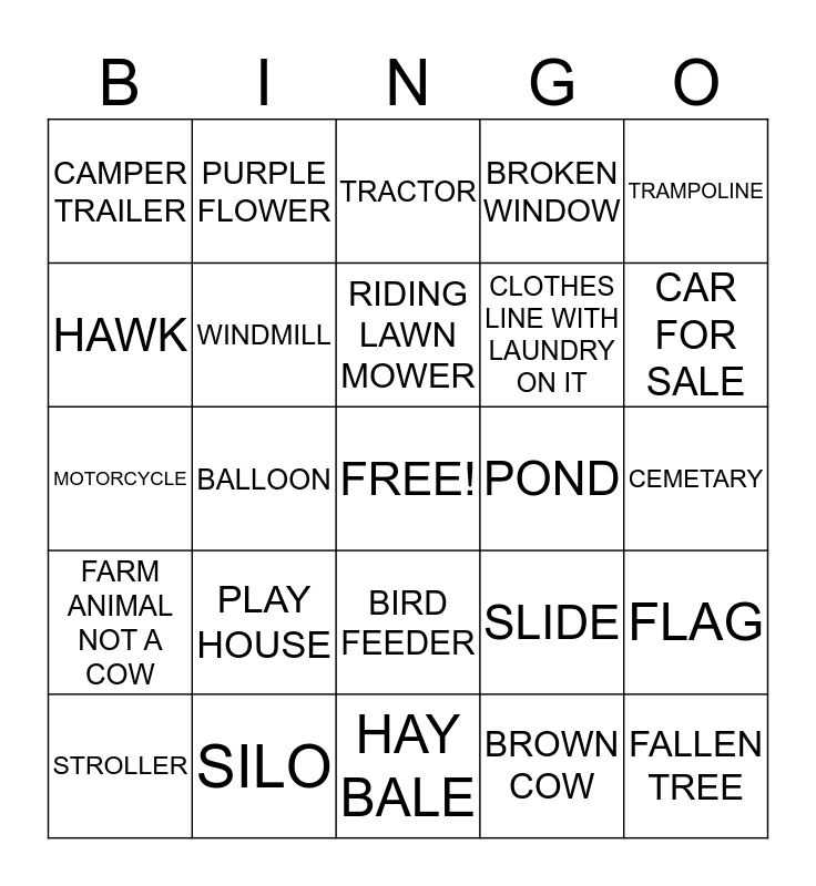 This bingo card has a free space and 24 words: PLAY HOUSE, SILO, RIDING LAWN MOWER, STROLLER, TRAMPOLINE, CAMPER TRAILER, HAWK, PURPLE FLOWER, POND, BIRD FEEDER, CLOTHES LINE WITH LAUNDRY ON IT, MOTORCYCLE, SLIDE, FLAG, WINDMILL, BROWN COW, CEMETARY, TRACTOR, CAR FOR SALE, BALLOON, FALLEN TREE, FARM ANIMAL NOT A COW, BROKEN WINDOW and HAY BALE.