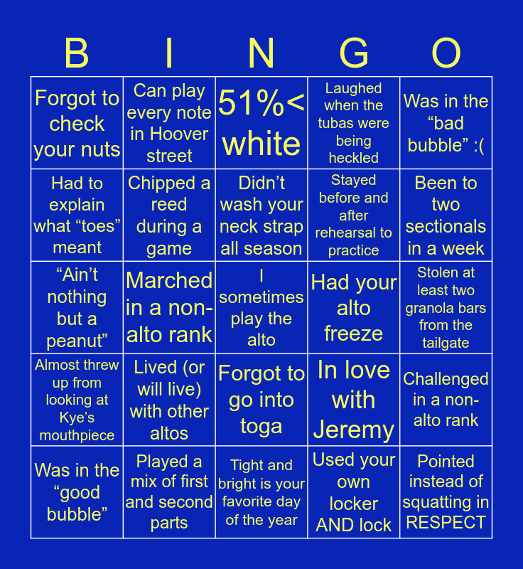 This bingo card has a free space and 24 words: Lived (or will live) with other altos, Played a mix of first and second parts, Didn’t wash your neck strap all season, Was in the “good bubble”, Was in the “bad bubble” :(, Forgot to check your nuts, Had to explain what “toes” meant, Can play every note in Hoover street, Had your alto freeze, Forgot to go into toga, Stayed before and after rehearsal to practice, “Ain’t nothing but a peanut”, In love with Jeremy, Challenged in a non-alto rank, Chipped a reed during a game, Used your own locker AND lock, Stolen at least two granola bars from the tailgate, 51%< white, Been to two sectionals in a week, Marched in a non-alto rank, Pointed instead of squatting in RESPECT, Almost threw up from looking at Kye’s mouthpiece, Laughed when the tubas were being heckled and Tight and bright is your favorite day of the year.