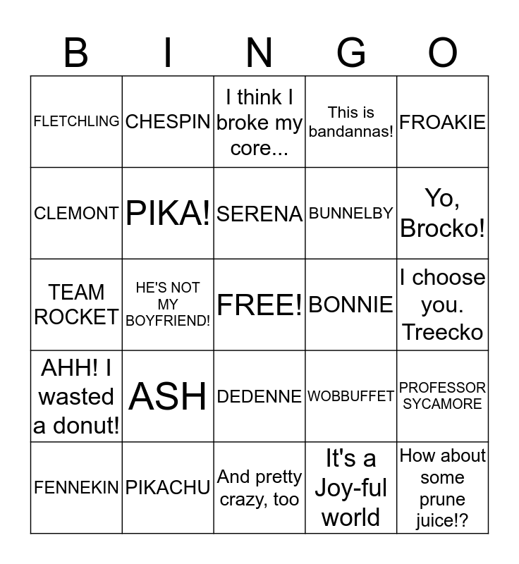 This bingo card has a free space and 24 words: ASH, PIKACHU, SERENA, FENNEKIN, FROAKIE, FLETCHLING, CLEMONT, CHESPIN, BONNIE, DEDENNE, BUNNELBY, TEAM ROCKET, WOBBUFFET, PROFESSOR SYCAMORE, PIKA!, It's a Joy-ful world, I choose you. Treecko, I think I broke my core..., Yo, Brocko!, HE'S NOT MY BOYFRIEND!, How about some prune juice!?, AHH! I wasted a donut!, This is bandannas! and And pretty crazy, too.