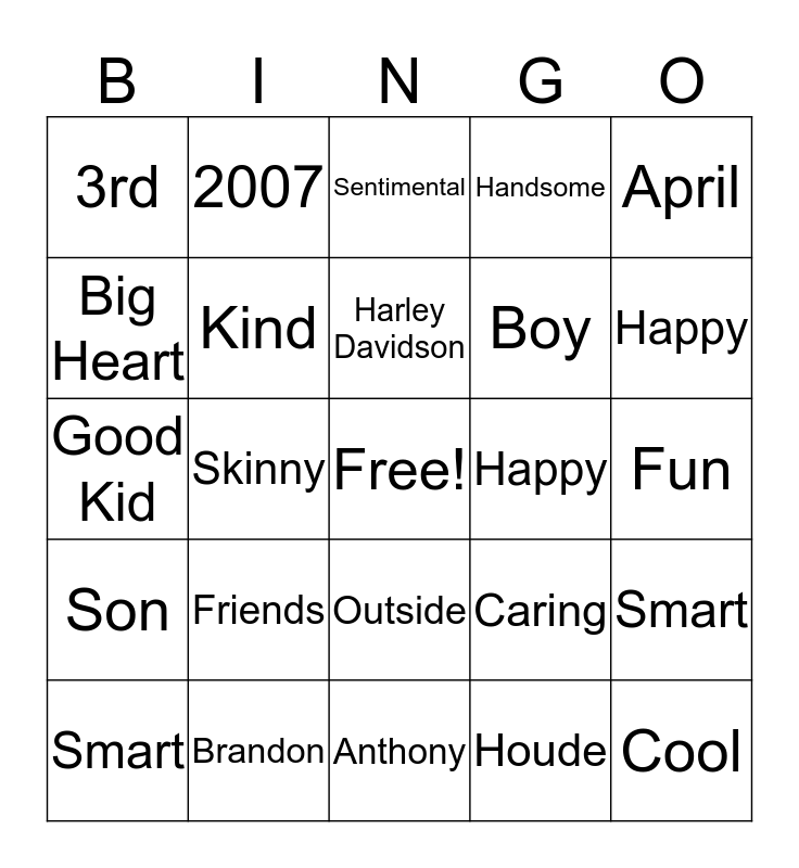 This bingo card has a free space and 25 words: Son, Brandon, Anthony, Houde, April, 3rd, 2007, Sentimental, Happy, Smart, Big Heart, Kind, Loving, Caring, Happy, Smart, Skinny, Harley Davidson, Boy, Fun, Good Kid, Friends, Outside, Handsome and Cool.