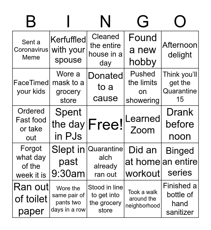 This bingo card has a free space and 24 words: Slept in past 9:30am, Wore the same pair of pants two days in a row, Donated to a cause, Ran out of toilet paper, Afternoon delight, Sent a Coronavirus Meme, FaceTimed your kids, Kerfuffled with your spouse, Learned Zoom, Quarantine alch already ran out, Pushed the limits on showering, Ordered Fast food or take out, Did an at home workout, Binged an entire series, Wore a mask to a grocery store, Took a walk around the neighborhood, Drank before noon, Cleaned the entire house in a day, Think you’ll get the Quarantine 15, Spent the day in PJs, Finished a bottle of hand sanitizer, Forgot what day of the week it is, Found a new hobby and Stood in line to get into the grocery store.