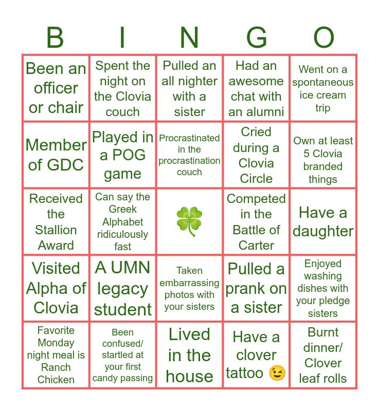 This bingo card has a free space and 24 words: Favorite Monday night meal is Ranch Chicken, A UMN legacy student, Procrastinated in the procrastination couch, Have a clover tattoo 😉, Went on a spontaneous ice cream trip, Been an officer or chair, Spent the night on the Clovia couch, Pulled an all nighter with a sister, Competed in the Battle of Carter, Have a daughter, Received the Stallion Award, Played in a POG game, Pulled a prank on a sister, Enjoyed washing dishes with your pledge sisters, Member of GDC, Been confused/ startled at your first candy passing, Lived in the house, Had an awesome chat with an alumni, Own at least 5 Clovia branded things, Visited Alpha of Clovia, Can say the Greek Alphabet ridiculously fast, Taken embarrassing photos with your sisters, Cried during a Clovia Circle and Burnt dinner/ Clover leaf rolls.