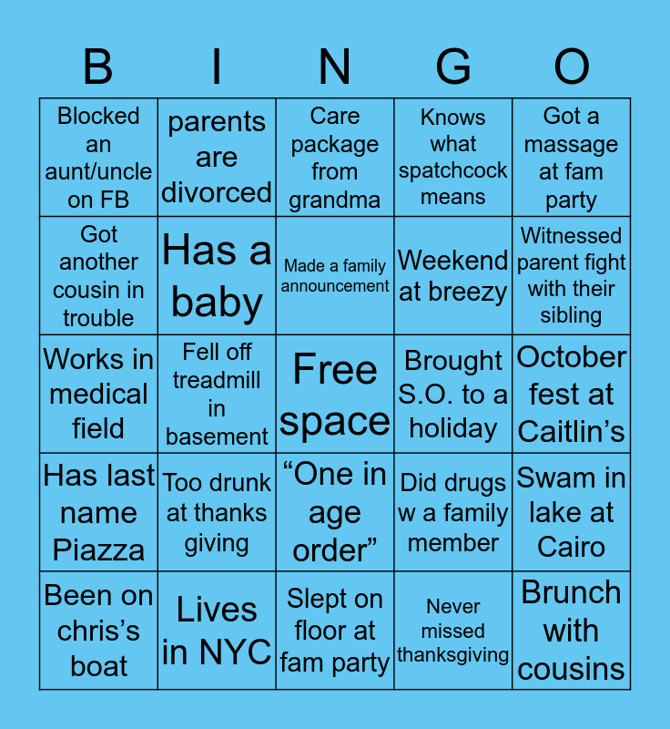This bingo card has a free space and 24 words: Too drunk at thanks giving, Lives in NYC, Made a family announcement, Been on chris’s boat, Got a massage at fam party, Blocked an aunt/uncle on FB, Got another cousin in trouble, parents are divorced, Brought S.O. to a holiday, “One in age order”, Weekend at breezy, Works in medical field, Did drugs w a family member, Swam in lake at Cairo, Has a baby, Never missed thanksgiving, October fest at Caitlin’s, Care package from grandma, Witnessed parent fight with their sibling, Fell off treadmill in basement, Brunch with cousins, Has last name Piazza, Knows what spatchcock means and Slept on floor at fam party.