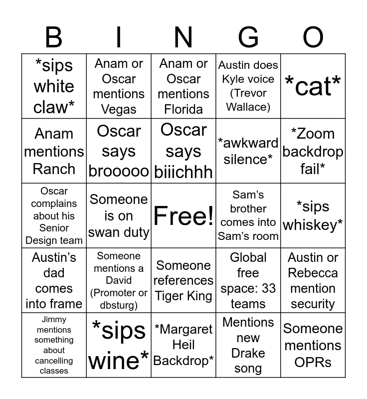 This bingo card has a free space and 27 words: Global free space: 33 teams, Oscar says “Chill out”, *awkward silence*, *Margaret Heil Backdrop*, Anam mentions Ranch, Anam or Oscar mentions Florida, Anam or Oscar mentions Vegas, Austin’s dad comes into frame, Sam’s brother comes into Sam’s room, Austin or Rebecca mention security, Oscar complains about his Senior Design team, Austin does Kyle voice (Trevor Wallace), Jimmy mentions something about cancelling classes, *sips wine*, *Zoom backdrop fail*, Someone says what they’re drinking, Oscar says brooooo, Oscar says biiichhh, Someone mentions a David (Promoter or dbsturg), *sips white claw*, *sips whiskey*, Mentions new Drake song, Someone is on swan duty, Someone mentions OPRs, Someone references Tiger King, *cat* and *dog*.