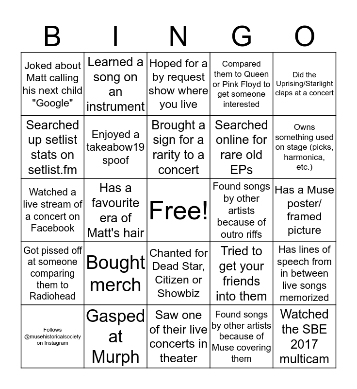 This bingo card has a free space and 24 words: Bought merch, Gasped at Murph, Brought a sign for a rarity to a concert, Follows @musehistoricalsociety on Instagram, Did the Uprising/Starlight claps at a concert, Joked about Matt calling his next child "Google", Searched up setlist stats on setlist.fm, Learned a song on an instrument, Found songs by other artists because of outro riffs, Chanted for Dead Star, Citizen or Showbiz, Searched online for rare old EPs, Watched a live stream of a concert on Facebook, Tried to get your friends into them, Has lines of speech from in between live songs memorized, Enjoyed a takeabow19 spoof, Found songs by other artists because of Muse covering them, Has a Muse poster/ framed picture, Hoped for a by request show where you live, Owns something used on stage (picks, harmonica, etc.), Has a favourite era of Matt's hair, Watched the SBE 2017 multicam, Got pissed off at someone comparing them to Radiohead, Compared them to Queen or Pink Floyd to get someone interested and Saw one of their live concerts in theater.