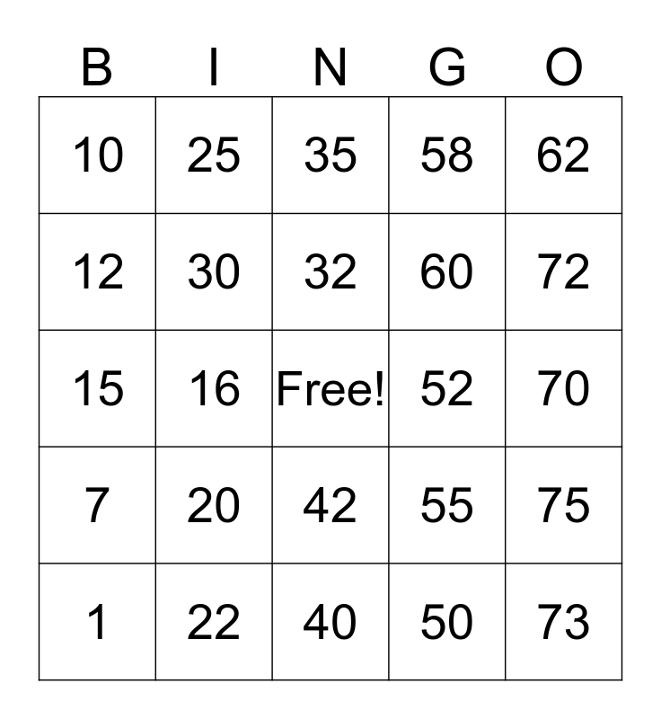This bingo card has a free space and 24 words: 1, 20, 32, 50, 62, 10, 25, 35, 52, 70, 15, 30, 55, 75, 12, 22, 40, 58, 72, 7, 16, 42, 60 and 73.