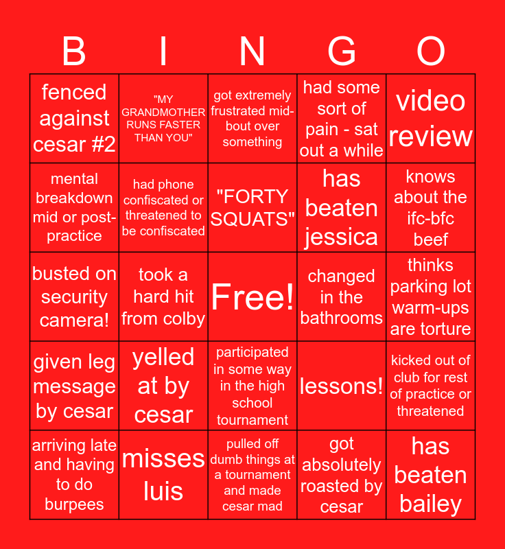 This bingo card has a free space and 24 words: yelled at by cesar, misses luis, "FORTY SQUATS", arriving late and having to do burpees, video review, fenced against cesar #2, mental breakdown mid or post-practice, "MY GRANDMOTHER RUNS FASTER THAN YOU", changed in the bathrooms, participated in some way in the high school tournament, has beaten jessica, busted on security camera!, lessons!, kicked out of club for rest of practice or threatened, had phone confiscated or threatened to be confiscated, got absolutely roasted by cesar, thinks parking lot warm-ups are torture, got extremely frustrated mid-bout over something, knows about the ifc-bfc beef, took a hard hit from colby, has beaten bailey, given leg message by cesar, had some sort of pain - sat out a while and pulled off dumb things at a tournament and made cesar mad.