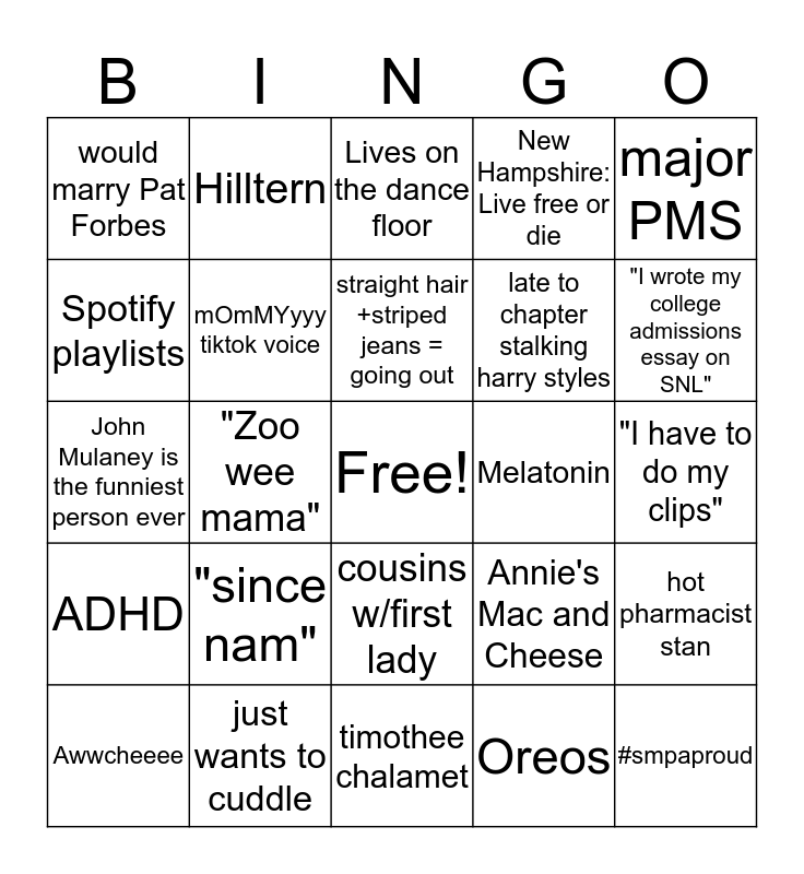 This bingo card has a free space and 24 words: "since nam", just wants to cuddle, straight hair +striped jeans = going out, Awwcheeee, major PMS, would marry Pat Forbes, Spotify playlists, Hilltern, Melatonin, cousins w/first lady, late to chapter stalking harry styles, John Mulaney is the funniest person ever, Annie's Mac and Cheese, hot pharmacist stan, mOmMYyyy tiktok voice, Oreos, "I have to do my clips", Lives on the dance floor, "I wrote my college admissions essay on SNL", "Zoo wee mama", #smpaproud, ADHD, New Hampshire: Live free or die and timothee chalamet.