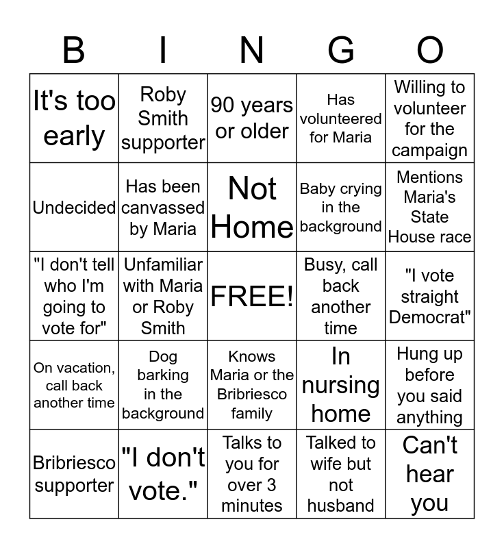 This bingo card has a free space and 24 words: Dog barking in the background, "I don't vote.", Not Home, Bribriesco supporter, Willing to volunteer for the campaign, It's too early, Undecided, Roby Smith supporter, Busy, call back another time, Knows Maria or the Bribriesco family, Baby crying in the background, "I don't tell who I'm going to vote for", In nursing home, Hung up before you said anything, Has been canvassed by Maria, Talked to wife but not husband, "I vote straight Democrat", 90 years or older, Mentions Maria's State House race, Unfamiliar with Maria or Roby Smith, Can't hear you, On vacation, call back another time, Has volunteered for Maria and Talks to you for over 3 minutes.