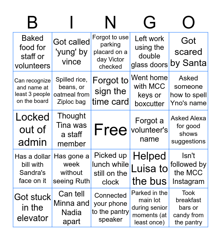 This bingo card has a free space and 24 words: Has gone a week without seeing Ruth, Can tell Minna and Nadia apart, Forgot to sign the time card, Got stuck in the elevator, Got scared by Santa, Baked food for staff or volunteers, Can recognize and name at least 3 people on the board, Got called 'yung' by vince, Forgot a volunteer's name, Picked up lunch while still on the clock, Went home with MCC keys or boxcutter, Locked out of admin, Helped Luisa to the bus, Isn't followed by the MCC Instagram, Spilled rice, beans, or oatmeal from Ziploc bag, Parked in the main lot during senior moments (at least once), Asked Alexa for good shows suggestions, Forgot to use parking placard on a day Victor checked, Asked someone how to spell Yno's name, Thought Tina was a staff member, Took breakfast bars or candy from the pantry, Has a dollar bill with Sandra's face on it, Left work using the double glass doors and Connected your phone to the pantry speaker.