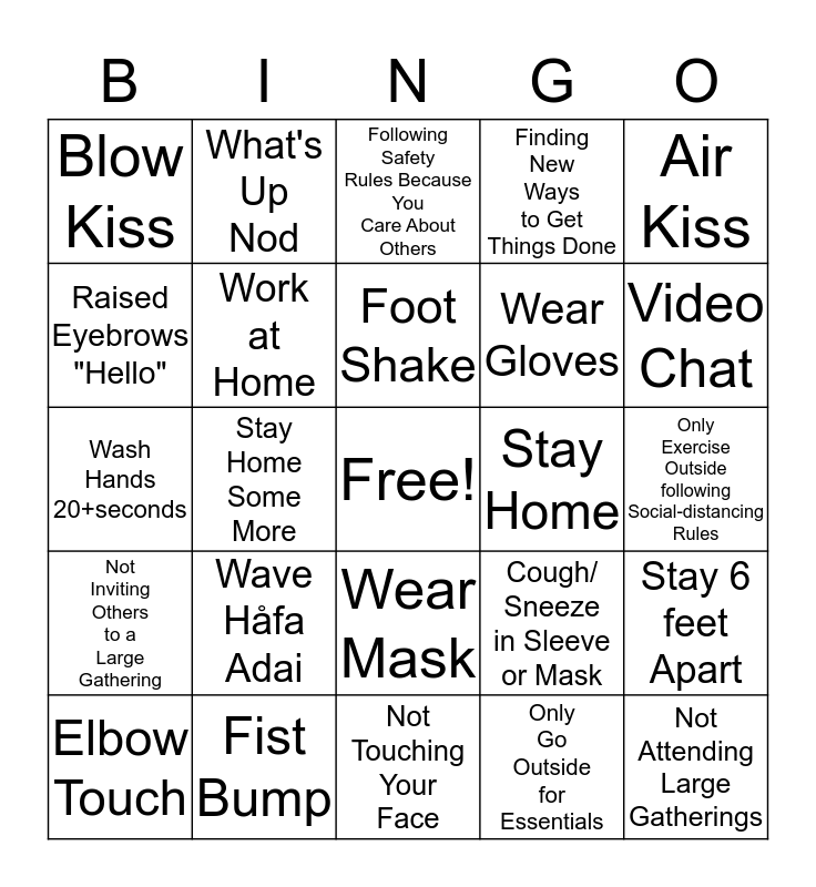 This bingo card has a free space and 24 words: Wave Håfa Adai, Fist Bump, Foot Shake, Elbow Touch, Air Kiss, Blow Kiss, Raised Eyebrows "Hello", What's Up Nod, Stay Home, Wear Mask, Wear Gloves, Wash Hands 20+seconds, Cough/ Sneeze in Sleeve or Mask, Stay 6 feet Apart, Work at Home, Only Go Outside for Essentials, Only Exercise Outside following Social-distancing Rules, Following Safety Rules Because You Care About Others, Video Chat, Stay Home Some More, Not Attending Large Gatherings, Not Inviting Others to a Large Gathering, Finding New Ways to Get Things Done and Not Touching Your Face.