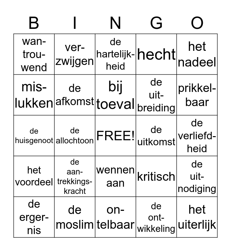 This bingo card has a free space and 40 words: de toekomst- muziek, de huisgenoot, vernoemen naar, de afkomst, de moslim, wennen aan, bij toeval, de harts- vriend- schap, het nadeel, het voordeel, de allochtoon, hecht, het uiterlijk, de verliefd- heid, de uitkomst, de aan- trekkings- kracht, arg- wanend, wan- trou- wend, achter- dochtig, de hartelijk- heid, de uit- nodiging, de ont- wikkeling, de uit- breiding, mis- lukken, redeneren, het verzoek, verlegen, stamelen, binnens-monds, schoor-voetend, de stotte-raar, de erger-nis, iets kwalijk nemen, kritisch, prikkel-baar, on-telbaar, verklaren, de over-tuigings-kracht, ver-zwijgen and zich ergeren aan.