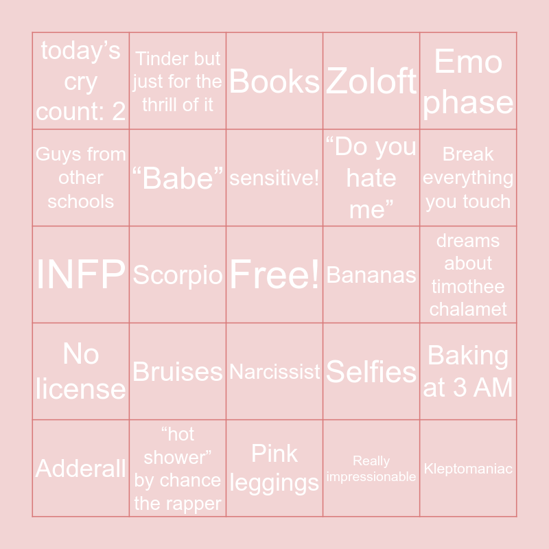 This bingo card has a free space and 24 words: Adderall, Bruises, sensitive!, Really impressionable, Emo phase, today’s cry count: 2, Tinder but just for the thrill of it, Books, Bananas, dreams about timothee chalamet, INFP, “Babe”, Selfies, Baking at 3 AM, Guys from other schools, “hot shower” by chance the rapper, Pink leggings, Zoloft, Break everything you touch, No license, Scorpio, Narcissist, “Do you hate me” and Kleptomaniac.