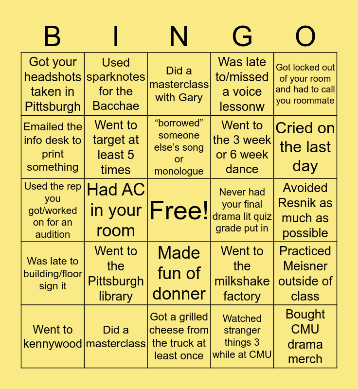 This bingo card has a free space and 24 words: Went to the Pittsburgh library, Did a masterclass, “borrowed” someone else’s song or monologue, Went to kennywood, Got locked out of your room and had to call you roommate, Got your headshots taken in Pittsburgh, Emailed the info desk to print something, Used sparknotes for the Bacchae, Never had your final drama lit quiz grade put in, Made fun of donner, Went to the 3 week or 6 week dance, Used the rep you got/worked on for an audition, Went to the milkshake factory, Practiced Meisner outside of class, Went to target at least 5 times, Watched stranger things 3 while at CMU, Avoided Resnik as much as possible, Did a masterclass with Gary, Cried on the last day, Had AC in your room, Bought CMU drama merch, Was late to building/floor sign it, Was late to/missed a voice lessonw and Got a grilled cheese from the truck at least once.