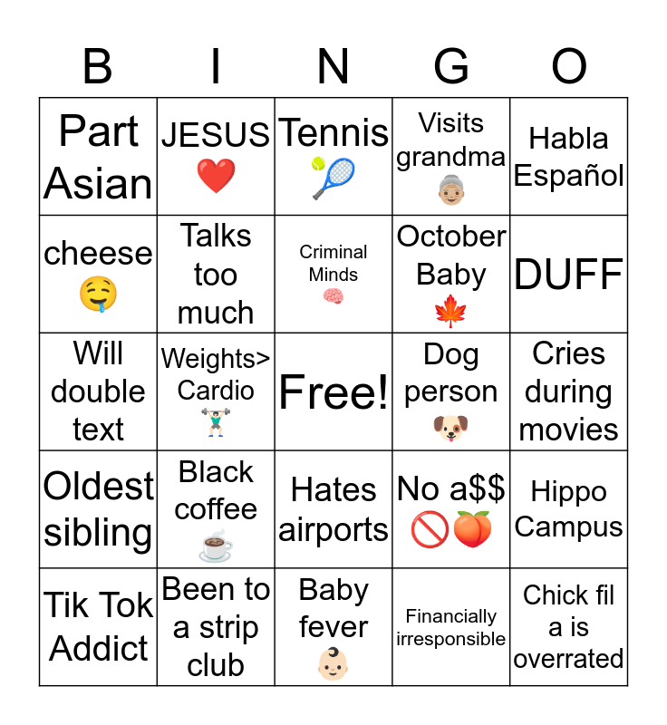 This bingo card has a free space and 24 words: Black coffee ☕️, Been to a strip club, Criminal Minds 🧠, Tik Tok Addict, Habla Español, Part Asian, cheese 🤤, JESUS ❤️, Dog person 🐶, Hates airports, October Baby 🍁, Will double text, No a$$ 🚫🍑, Hippo Campus, Talks too much, Financially irresponsible, Cries during movies, Tennis 🎾, DUFF, Weights> Cardio 🏋🏻♂️, Chick fil a is overrated, Oldest sibling, Visits grandma 👵🏼 and Baby fever 👶🏻.