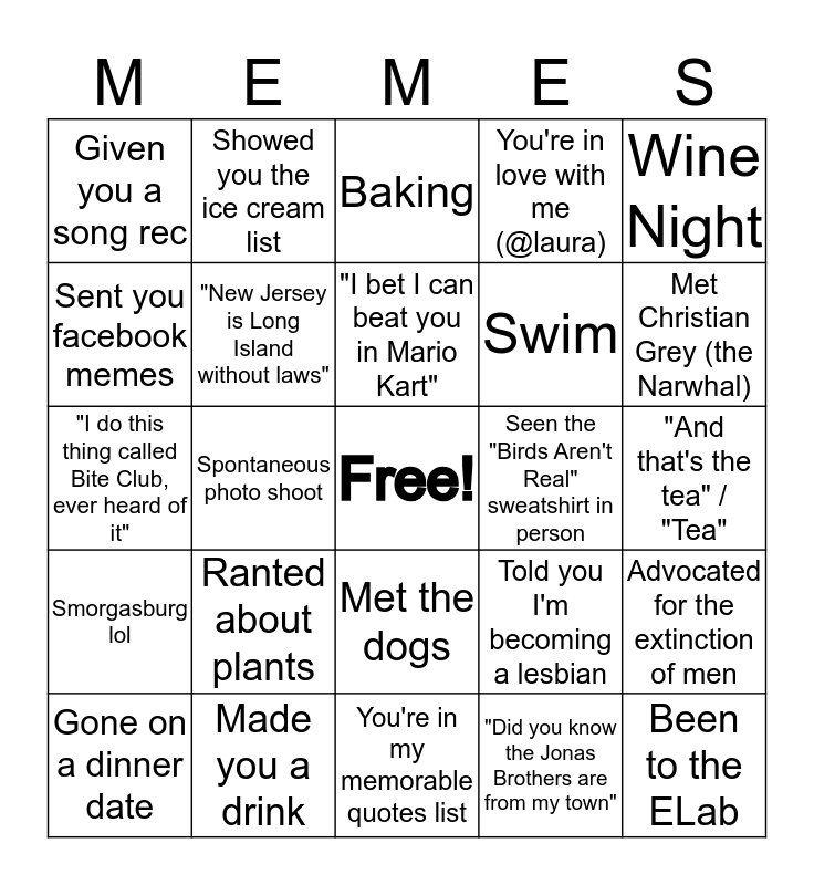 This bingo card has a free space and 24 words: Ranted about plants, Made you a drink, "I bet I can beat you in Mario Kart", Gone on a dinner date, Wine Night, Given you a song rec, Sent you facebook memes, Showed you the ice cream list, Seen the "Birds Aren't Real" sweatshirt in person, Met the dogs, Swim, "I do this thing called Bite Club, ever heard of it", Told you I'm becoming a lesbian, Advocated for the extinction of men, "New Jersey is Long Island without laws", "Did you know the Jonas Brothers are from my town", "And that's the tea" / "Tea", Baking, Met Christian Grey (the Narwhal), Spontaneous photo shoot, Been to the ELab, Smorgasburg lol, You're in love with me (@laura) and You're in my memorable quotes list.