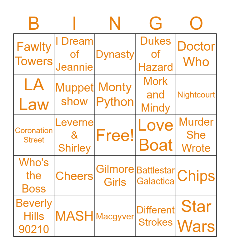 This bingo card has a free space and 51 words: Thunderbirds, Star Wars, Magnum PI, Macgyver, Cheers, Dallas, I Dream of Jeannie, Greatest American Hero, LA Law, Miami Vice, Muppet show, Dukes of Hazard, Chips, Battlestar Galactica, Chicago Hope, The Jetsons, Monty Python, Love Boat, Pink Panther, Doctor Who, Leverne & Shirley, Different Strokes, Fawlty Towers, Mork and Mindy, A Team, Flintstones, Nightcourt, Spider man, Beverly Hills 90210, Dynasty, Happy Days, Gilligans Island, Hill Street Blues, Kojak, Knight Rider, MASH, Remington Steele, The Addams Family, Mission Impossible, Ghost Busters, Murder She Wrote, Who's the Boss, WonderWoman, Six Million Dollar Man, Star Trek, BJ and the Bear, Coronation Street, charlies angels, love & marriage, Gilmore Girls and Smurfs.
