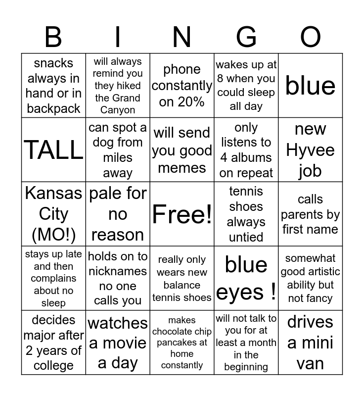This bingo card has a free space and 24 words: holds on to nicknames no one calls you, watches a movie a day, will send you good memes, decides major after 2 years of college, blue, snacks always in hand or in backpack, TALL, will always remind you they hiked the Grand Canyon, tennis shoes always untied, really only wears new balance tennis shoes, only listens to 4 albums on repeat, Kansas City (MO!), blue eyes !, somewhat good artistic ability but not fancy, can spot a dog from miles away, will not talk to you for at least a month in the beginning, calls parents by first name, phone constantly on 20%, new Hyvee job, pale for no reason, drives a mini van, stays up late and then complains about no sleep, wakes up at 8 when you could sleep all day and makes chocolate chip pancakes at home constantly.