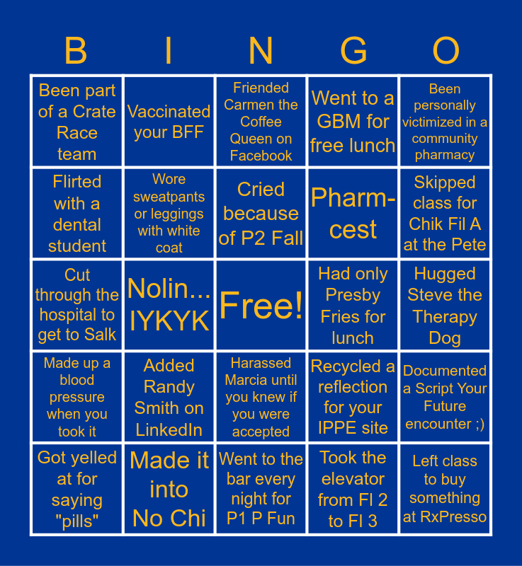 This bingo card has a free space and 24 words: Added Randy Smith on LinkedIn, Made it into No Chi, Cried because of P2 Fall, Got yelled at for saying "pills", Been personally victimized in a community pharmacy, Been part of a Crate Race team, Flirted with a dental student, Vaccinated your BFF, Had only Presby Fries for lunch, Harassed Marcia until you knew if you were accepted, Pharm-cest, Cut through the hospital to get to Salk, Recycled a reflection for your IPPE site, Documented a Script Your Future encounter ;), Wore sweatpants or leggings with white coat, Took the elevator from Fl 2 to Fl 3, Hugged Steve the Therapy Dog, Friended Carmen the Coffee Queen on Facebook, Skipped class for Chik Fil A at the Pete, Nolin... IYKYK, Left class to buy something at RxPresso, Made up a blood pressure when you took it, Went to a GBM for free lunch and Went to the bar every night for P1 P Fun.