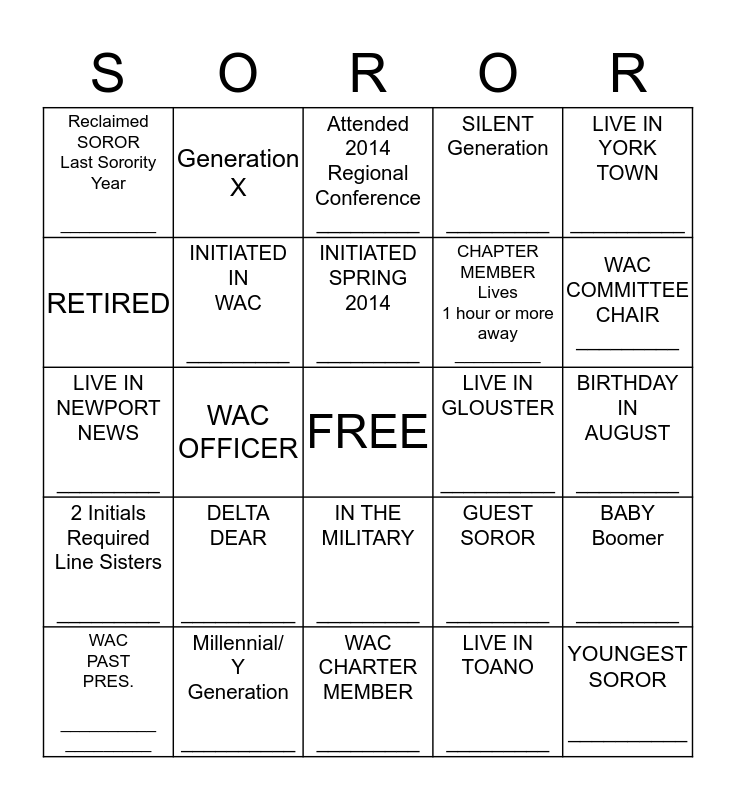 This bingo card has a free space and 24 words: DELTA DEAR __________, Millennial/ Y Generation __________, INITIATED SPRING 2014 _________, WAC PAST PRES. __________ _________, LIVE IN YORK TOWN __________, Reclaimed SOROR Last Sorority Year __________, RETIRED, Generation X, LIVE IN GLOUSTER __________, IN THE MILITARY _________, CHAPTER MEMBER Lives 1 hour or more away _________, LIVE IN NEWPORT NEWS _________, GUEST SOROR _________, BABY Boomer _________, INITIATED IN WAC _________, LIVE IN TOANO _________, BIRTHDAY IN AUGUST _________, Attended 2014 Regional Conference _________, WAC COMMITTEE CHAIR _________, WAC OFFICER, YOUNGEST SOROR __________, 2 Initials Required Line Sisters _________, SILENT Generation _________ and WAC CHARTER MEMBER _________.
