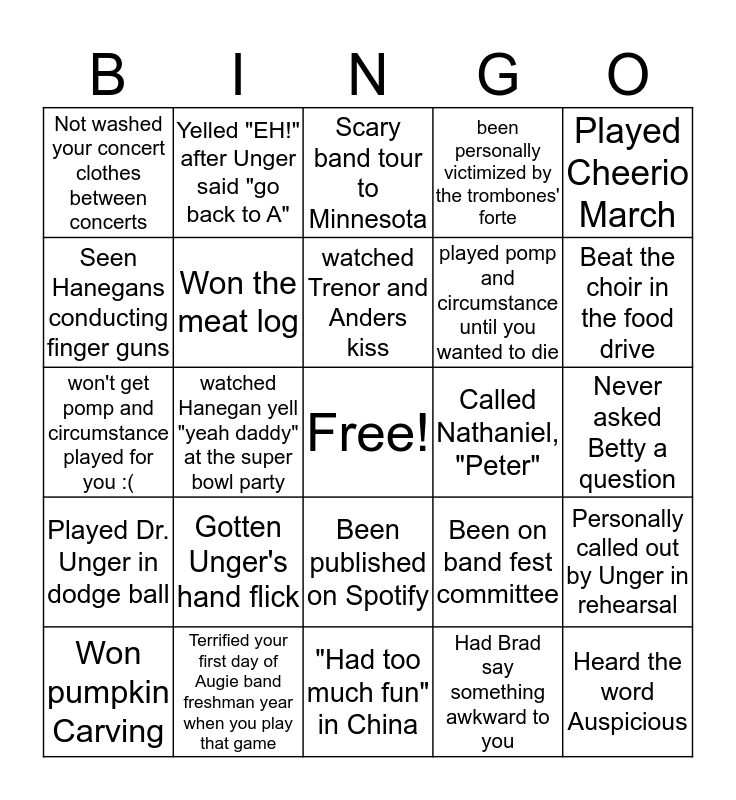 This bingo card has a free space and 24 words: Gotten Unger's hand flick, Terrified your first day of Augie band freshman year when you play that game, watched Trenor and Anders kiss, Won pumpkin Carving, Played Cheerio March, Not washed your concert clothes between concerts, Seen Hanegans conducting finger guns, Yelled "EH!" after Unger said "go back to A", Called Nathaniel, "Peter", Been published on Spotify, played pomp and circumstance until you wanted to die, won't get pomp and circumstance played for you :(, Been on band fest committee, Personally called out by Unger in rehearsal, Won the meat log, Had Brad say something awkward to you, Never asked Betty a question, Scary band tour to Minnesota, Beat the choir in the food drive, watched Hanegan yell "yeah daddy" at the super bowl party, Heard the word Auspicious, Played Dr. Unger in dodge ball, been personally victimized by the trombones' forte and "Had too much fun" in China.