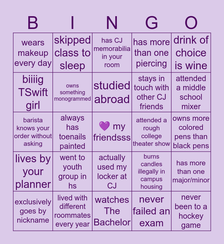This bingo card has a free space and 24 words: went to youth group in hs, lived with different roommates every year, studied abroad, exclusively goes by nickname, drink of choice is wine, wears makeup every day, biiiig TSwift girl, skipped class to sleep, attended a rough college theater show, actually used my locker at CJ, stays in touch with other CJ friends, barista knows your order without asking, burns candles illegally in campus housing, has more than one major/minor, owns something monogrammed, never failed an exam, owns more colored pens than black pens, has CJ memorabilia in your room, attended a middle school mixer, always has toenails painted, never been to a hockey game, lives by your planner, has more than one piercing and watches The Bachelor.
