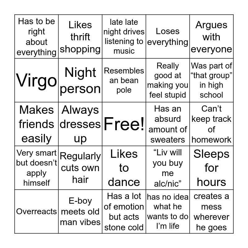 This bingo card has a free space and 24 words: Regularly cuts own hair, E-boy meets old man vibes, Resembles an bean pole, Overreacts, Argues with everyone, Has to be right about everything, Virgo, Likes thrift shopping, Has an absurd amount of sweaters, Likes to dance, Really good at making you feel stupid, Makes friends easily, “Liv will you buy me alc/nic”, Sleeps for hours, Night person, has no idea what he wants to do I’m life, Can’t keep track of homework, late late night drives listening to music, Was part of “that group” in high school, Always dresses up, creates a mess wherever he goes, Very smart but doesn’t apply himself, Loses everything and Has a lot of emotion but acts stone cold.