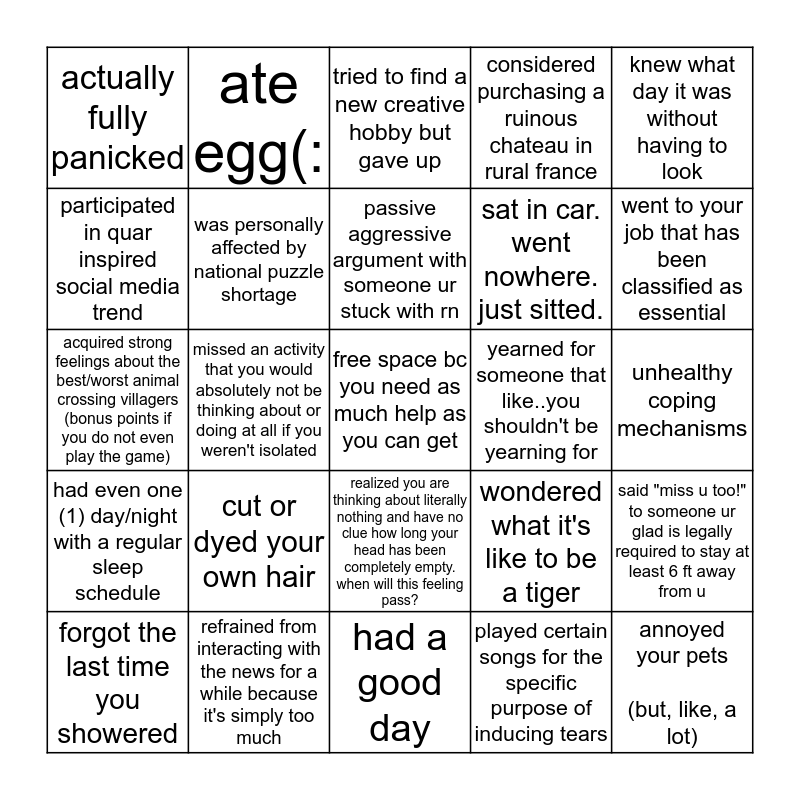 This bingo card has a free space and 24 words: cut or dyed your own hair, refrained from interacting with the news for a while because it's simply too much, passive aggressive argument with someone ur stuck with rn, forgot the last time you showered, knew what day it was without having to look, actually fully panicked, participated in quar inspired social media trend, ate egg(:, yearned for someone that like..you shouldn't be yearning for, realized you are thinking about literally nothing and have no clue how long your head has been completely empty. when will this feeling pass?, sat in car. went nowhere. just sitted., acquired strong feelings about the best/worst animal crossing villagers (bonus points if you do not even play the game), wondered what it's like to be a tiger, said "miss u too!" to someone ur glad is legally required to stay at least 6 ft away from u, was personally affected by national puzzle shortage, played certain songs for the specific purpose of inducing tears, unhealthy coping mechanisms, tried to find a new creative hobby but gave up, went to your job that has been classified as essential, missed an activity that you would absolutely not be thinking about or doing at all if you weren't isolated, annoyed your pets (but, like, a lot), had even one (1) day/night with a regular sleep schedule, considered purchasing a ruinous chateau in rural france and had a good day.