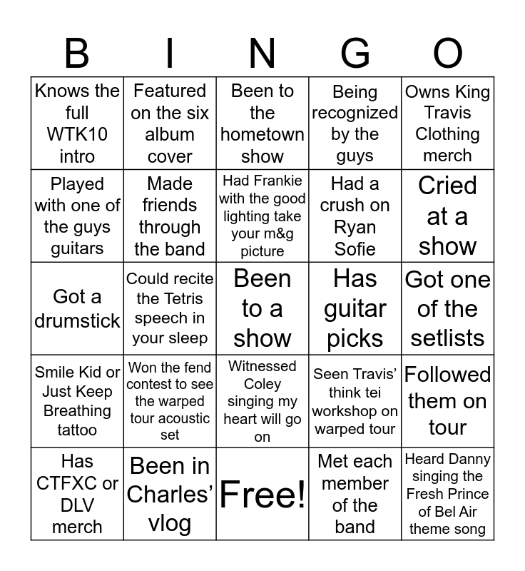 This bingo card has 25 words: Smile Kid or Just Keep Breathing tattoo, Been in Charles’ vlog, Been to a show, Met each member of the band, Owns King Travis Clothing merch, Knows the full WTK10 intro, Featured on the six album cover, Been to the hometown show, Has guitar picks, Followed them on tour, Played with one of the guys guitars, Made friends through the band, Free!, Seen Travis’ think tei workshop on warped tour, Cried at a show, Has CTFXC or DLV merch, Could recite the Tetris speech in your sleep, Had Frankie with the good lighting take your m&g picture, Had a crush on Ryan Sofie, Got one of the setlists, Got a drumstick, Won the fend contest to see the warped tour acoustic set, Witnessed Coley singing my heart will go on, Being recognized by the guys and Heard Danny singing the Fresh Prince of Bel Air theme song.