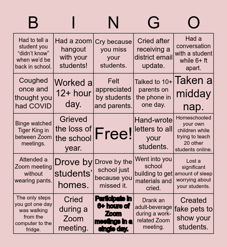 This bingo card has a free space and 24 words: Drove by students’ homes., Cried during a Zoom meeting., Felt appreciated by students and parents., The only steps you got one day was walking from the computer to the fridge., Had a conversation with a student while 6+ ft apart., Had to tell a student you “didn’t know” when we’d be back in school., Coughed once and thought you had COVID, Had a zoom hangout with your students!, Hand-wrote letters to all your students., Drove by the school just because you missed it., Talked to 10+ parents on the phone in one day., Binge watched Tiger King in between Zoom meetings., Went into you school building to get materials and cried., Lost a significant amount of sleep worrying about your students., Worked a 12+ hour day., Drank an adult-beverage during a work-related Zoom meeting., Homeschooled your own children while trying to teach 20 other students online., Cry because you miss your students., Taken a midday nap., Grieved the loss of the school year., Created fake pets to show your students., Attended a Zoom meeting without wearing pants., Cried after receiving a district email update. and Participate in 6+ hours of Zoom meetings in a single day..