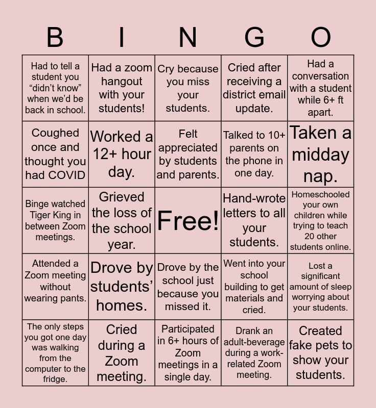 This bingo card has a free space and 24 words: Drove by students’ homes., Cried during a Zoom meeting., Felt appreciated by students and parents., The only steps you got one day was walking from the computer to the fridge., Had a conversation with a student while 6+ ft apart., Had to tell a student you “didn’t know” when we’d be back in school., Coughed once and thought you had COVID, Had a zoom hangout with your students!, Hand-wrote letters to all your students., Drove by the school just because you missed it., Talked to 10+ parents on the phone in one day., Binge watched Tiger King in between Zoom meetings., Went into your school building to get materials and cried., Lost a significant amount of sleep worrying about your students., Worked a 12+ hour day., Drank an adult-beverage during a work-related Zoom meeting., Homeschooled your own children while trying to teach 20 other students online., Cry because you miss your students., Taken a midday nap., Grieved the loss of the school year., Created fake pets to show your students., Attended a Zoom meeting without wearing pants., Cried after receiving a district email update. and Participated in 6+ hours of Zoom meetings in a single day..