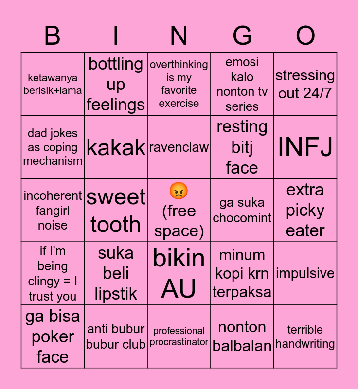 This bingo card has a free space and 24 words: suka beli lipstik, anti bubur bubur club, ravenclaw, ga bisa poker face, stressing out 24/7, ketawanya berisik+lama, dad jokes as coping mechanism, bottling up feelings, ga suka chocomint, bikin AU, resting bitj face, incoherent fangirl noise, minum kopi krn terpaksa, impulsive, kakak, nonton balbalan, extra picky eater, overthinking is my favorite exercise, INFJ, sweet tooth, terrible handwriting, if I'm being clingy = I trust you, emosi kalo nonton tv series and professional procrastinator.