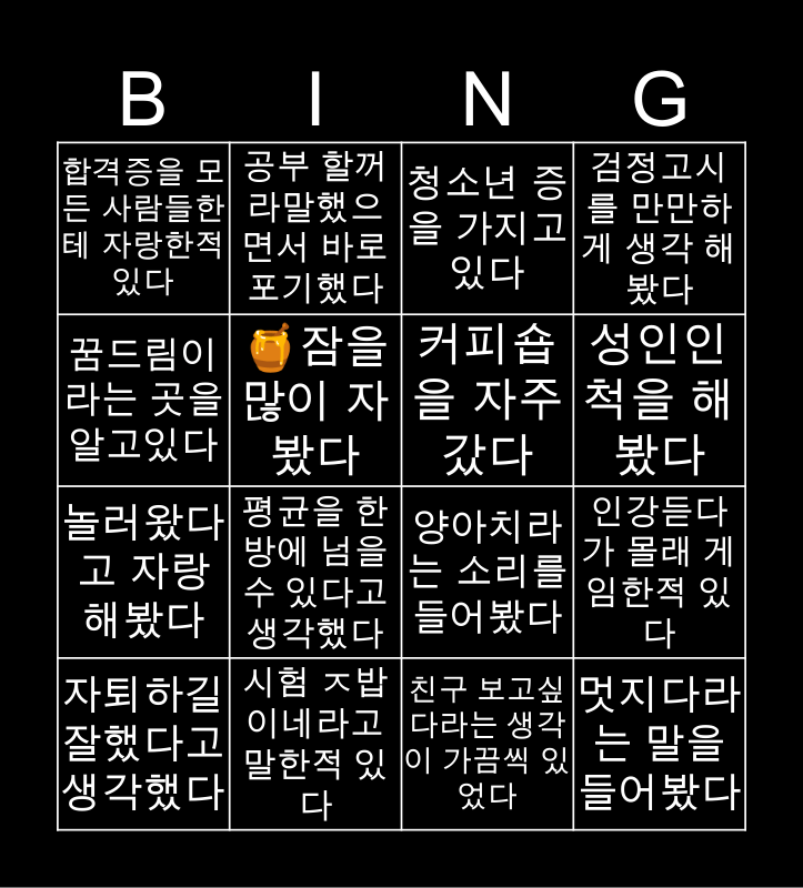 This bingo card has 16 words: 시험 ㅈ밥이네라고 말한적 있다, 인강듣다가 몰래 게임한적 있다, 청소년 증을 가지고 있다, 합격증을 모든 사람들한테 자랑한적 있다, 놀러왔다고 자랑 해봤다, 공부 할꺼라말했으면서 바로 포기했다, 양아치라는 소리를들어봤다, 친구 보고싶다라는 생각이 가끔씩 있었다, 꿈드림이라는 곳을 알고있다, 🍯잠을 많이 자봤다, 자퇴하길 잘했다고 생각했다, 검정고시를 만만하게 생각 해봤다, 평균을 한방에 넘을수 있다고 생각했다, 성인인척을 해봤다, 커피숍을 자주갔다 and 멋지다라는 말을 들어봤다.
