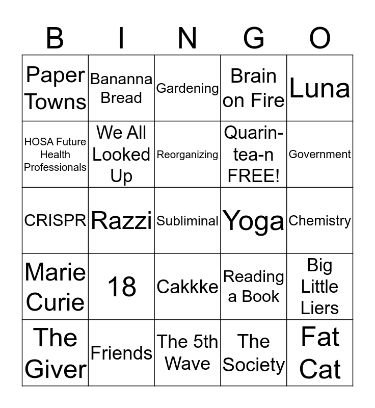 This bingo card has a free space and 57 words: Harry Potter, The Giver, The Girl with all the Gifts, Paper Towns, The 5th Wave, Partials, We All Looked Up, The Alchemist, Quarin-tea-n FREE!, The Maze Runner, Brain on Fire, Taking Flight, Ollie, June, Carys, Winkie, Luna, Razzi, Willow, Fat Cat, Yoga, Riding Horses, Reading a Book, Gardening, Baking, Reorganizing, Snapchat, Instagram, Government, Statistics, Physics, English, Spanish, Chem-is-cry, Chemistry, HOSA Future Health Professionals, STEM, CRISPR, Jennifer Doudna, Marie Curie, Bananna Bread, Cakkke, Scones, City Brew, Coffee, TEAAAAAAAA, 18, Friends, Sherlock, Hamilton, Monty Python, The Society, John Mulaney, Noah Trevor's Daily Show, To All the Boys I've Loved Before, Big Little Liers and Taylor Swift's Album "Lover".