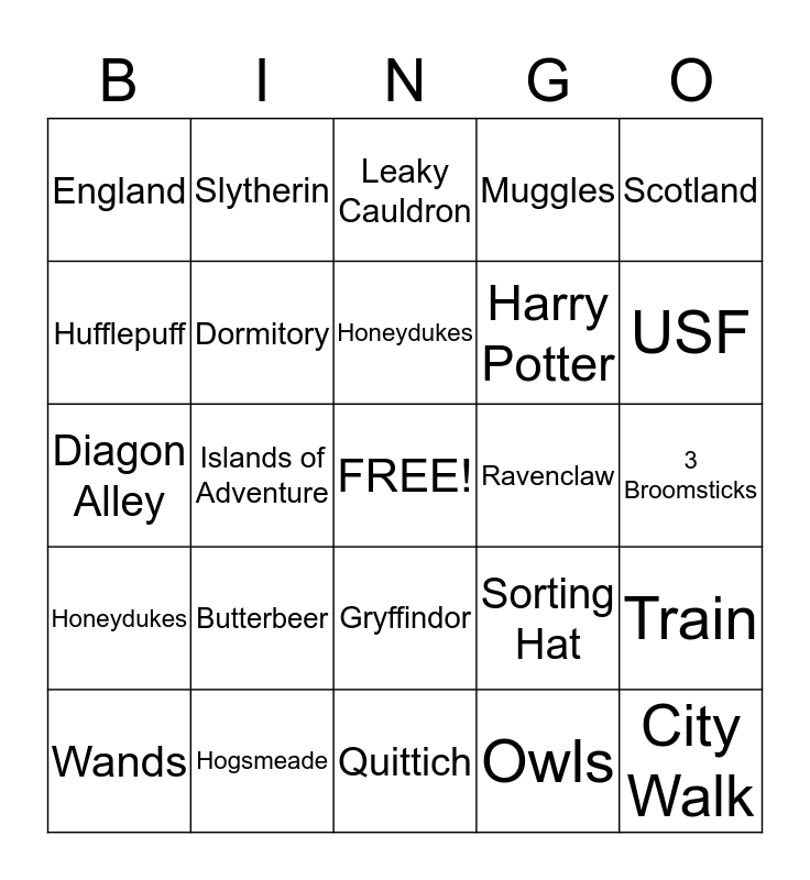 This bingo card has a free space and 24 words: Butterbeer, Hogsmeade, Honeydukes, Wands, Scotland, England, Hufflepuff, Slytherin, Ravenclaw, Gryffindor, Harry Potter, Diagon Alley, Sorting Hat, Train, Dormitory, Owls, 3 Broomsticks, Leaky Cauldron, USF, Islands of Adventure, City Walk, Honeydukes, Muggles and Quittich.