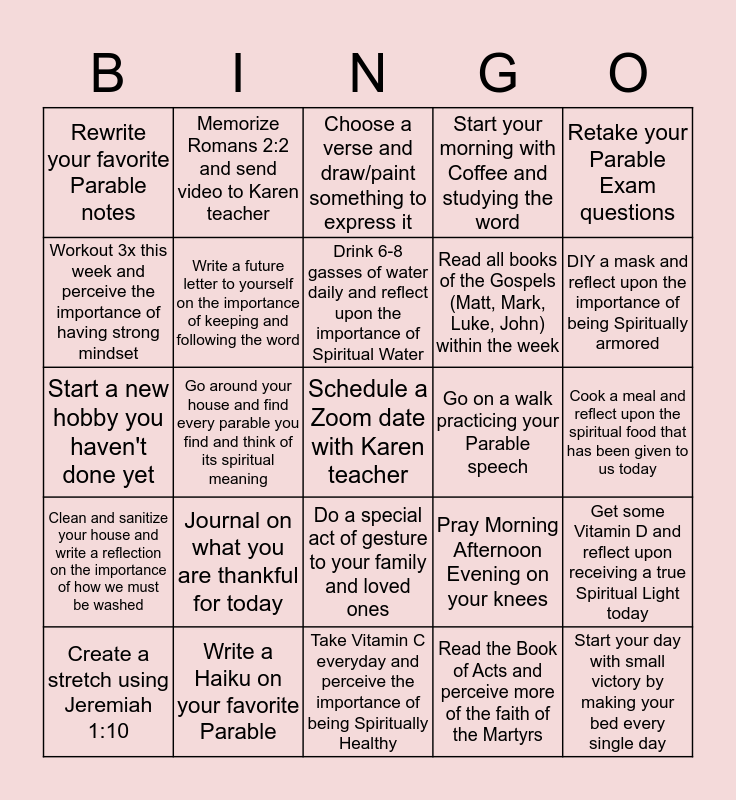 This bingo card has 25 words: Journal on what you are thankful for today, Take Vitamin C everyday and perceive the importance of being Spiritually Healthy, Drink 6-8 gasses of water daily and reflect upon the importance of Spiritual Water, Create a stretch using Jeremiah 1:10, Retake your Parable Exam questions, Rewrite your favorite Parable notes, Workout 3x this week and perceive the importance of having strong mindset, Memorize Romans 2:2 and send video to Karen teacher, Go on a walk practicing your Parable speech, Do a special act of gesture to your family and loved ones, Read all books of the Gospels (Matt, Mark, Luke, John) within the week, Start a new hobby you haven't done yet, Pray Morning Afternoon Evening on your knees, Get some Vitamin D and reflect upon receiving a true Spiritual Light today, Write a future letter to yourself on the importance of keeping and following the word, Start your day with small victory by making your bed every single day, Cook a meal and reflect upon the spiritual food that has been given to us today, Choose a verse and draw/paint something to express it, DIY a mask and reflect upon the importance of being Spiritually armored, Go around your house and find every parable you find and think of its spiritual meaning, Schedule a Zoom date with Karen teacher, Write a Haiku on your favorite Parable, Clean and sanitize your house and write a reflection on the importance of how we must be washed, Start your morning with Coffee and studying the word and Read the Book of Acts and perceive more of the faith of the Martyrs.